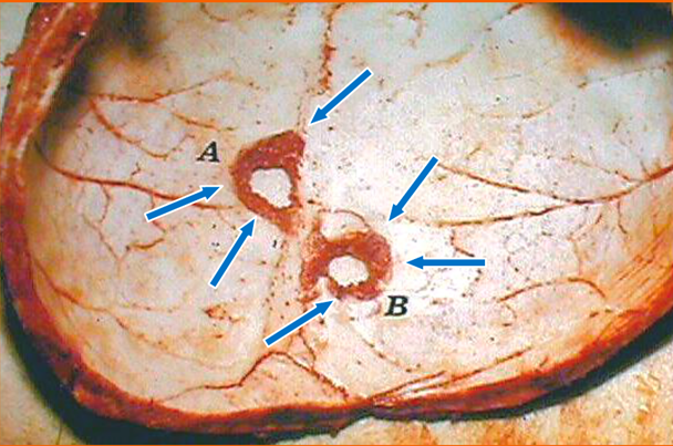 In figura si osservano due fori provocati da proiettili calibro 7,65 Browning a livello della teca cranica, osservati dal lato esterno (immagine superiore) e dal lato interna (immagine inferiore) di questa. È evidente l’erosione a spese del tavolato interno. Immagine tratta dal Libro “Patologia medico-legale e Tanatologia” di Vinci F. e altri autori.
