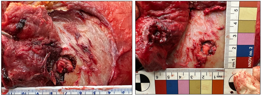 In tali foto, si osserva un foro d’uscita provocato da proiettile calibro 7,65 Browning a livello dell’osso temporale di sinistra della teca cranica, osservato dal lato esterno. È evidente l’erosione a spese del tavolato esterno con forma a cono svasato verso l’esterno. Caso di suicidio con pistola Beretta mod. 70 cal. 7,65 Browning.