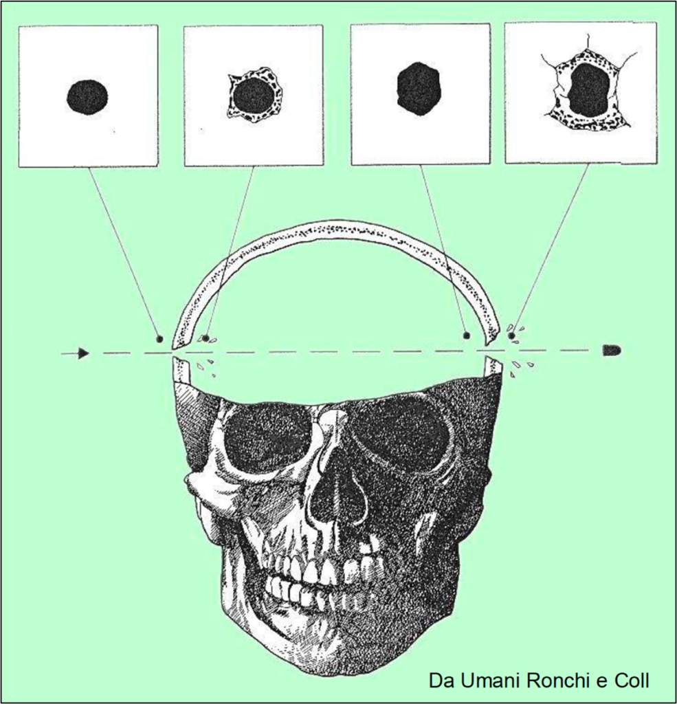 Il proiettile, quando colpisce le ossa piatte determina sulla superficie ossea un’erosione opposta rispetto a quella di ingresso del proiettile, come mostrato nella figura seguente.