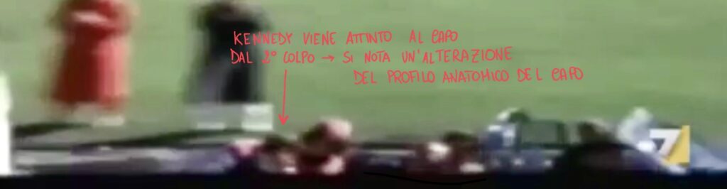 - Un secondo proiettile avrebbe attinto il Presidente al dorso, sarebbe fuoriuscito dalla superficie anteriore del collo, provocando lesioni al governatore del Texas che prendeva posto davanti a Kennedy. Questa evenienza è stata però ampiamente contestata e vi sono vaste argomentazioni tecniche che ne qualificano l’impossibilità;
