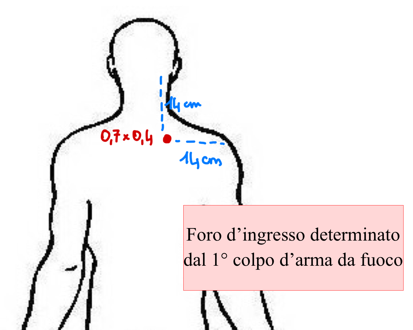 Il Dott. Humes descrive la presenza di una soluzione di continuo ovale, delle dimensioni di 0,7×0.4 cm circa, situata in corrispondenza della porzione superiore destra del dorso, a circa 14 cm dal processo acromiale omolaterale e 14 cm al di sotto del processo mastoideo destro.