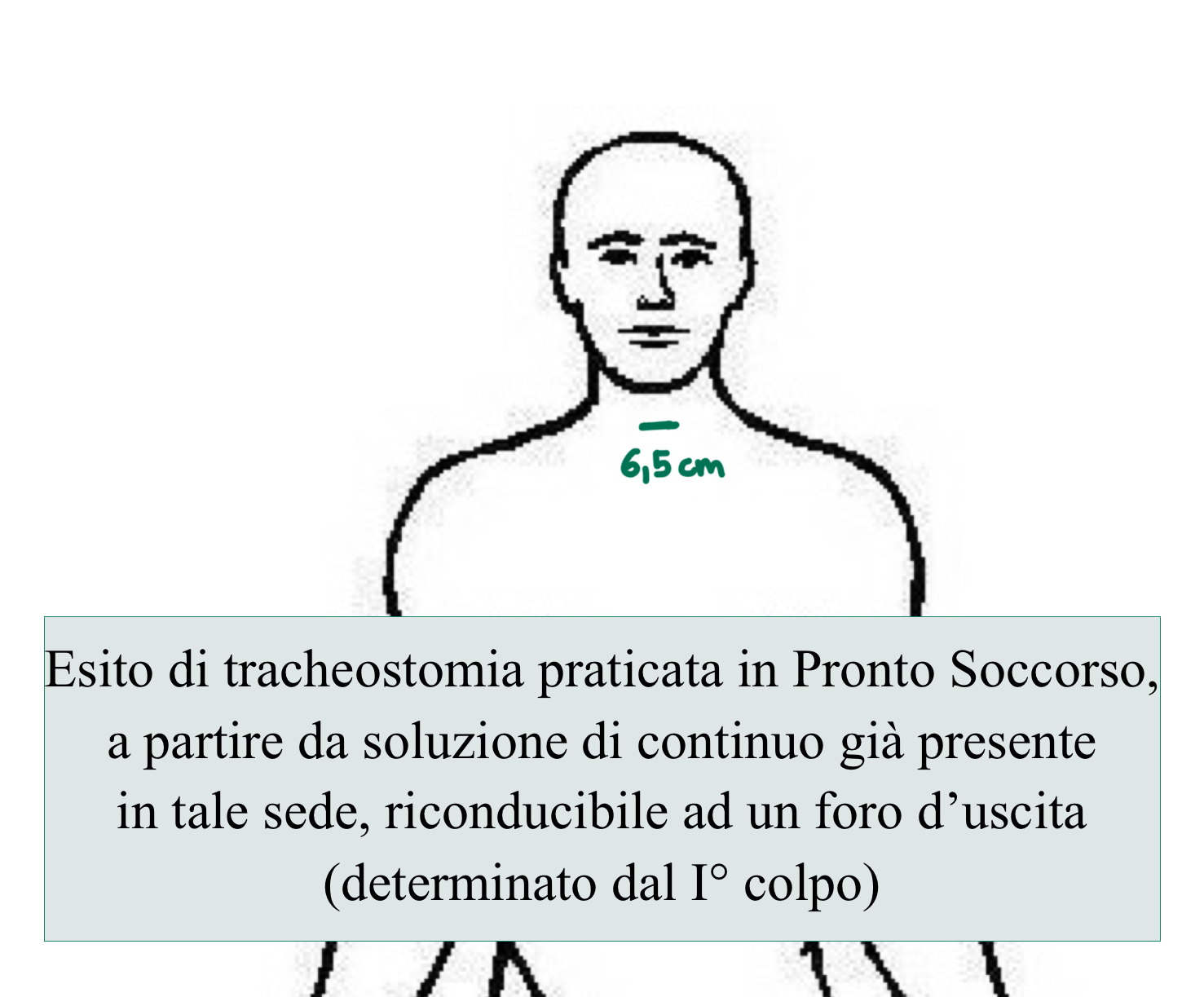 Evidenzia inoltre nella porzione inferiore della regione anteriore del collo, approssimativamente a livello del III e IV anello tracheale, una soluzione di continuo, disposta trasversalmente, della lunghezza di 6,5 cm.