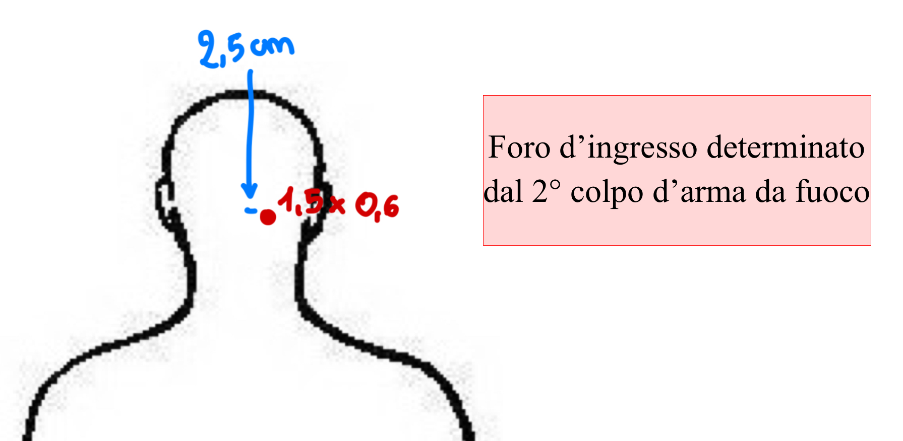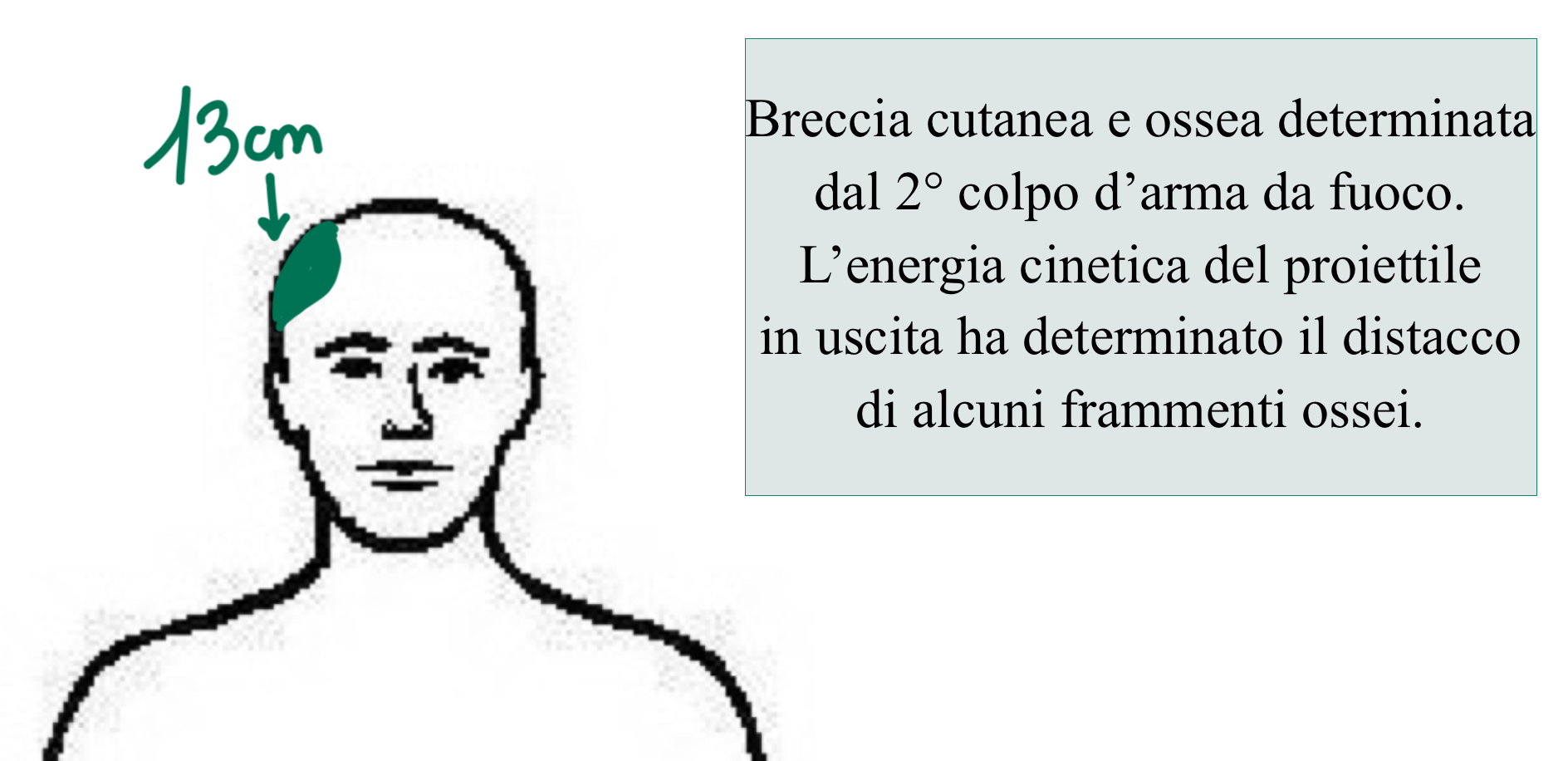 In particolare, il medico legale descrive una soluzione di continuo delle dimensioni di 1,5 x 0,6 cm, presente in corrispondenza della regione occipitale destra, superiormente alla protuberanza occipitale esterna e a 2,5 cm dalla linea mediana. Sottolinea inoltre che la lesione attraversa l’intero spessore cranico, mostrando margini “svasati” quando osservata dalla superficie cranica interna. L’aspetto dei margini così descritto ci fa comprendere che trattasi di un foro d’ingresso; infatti, i margini ossei si svasano verso la direzione seguita dal proiettile nel suo percorso.